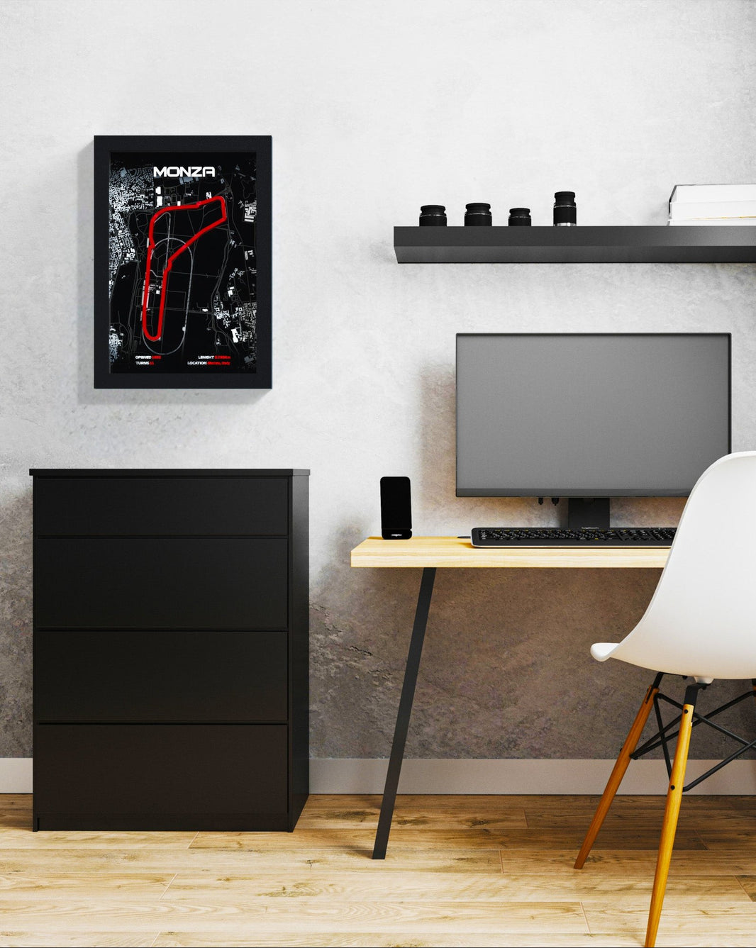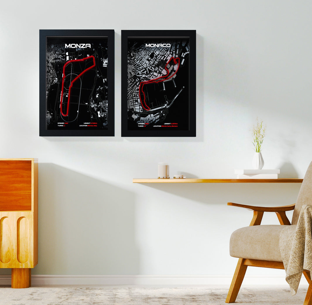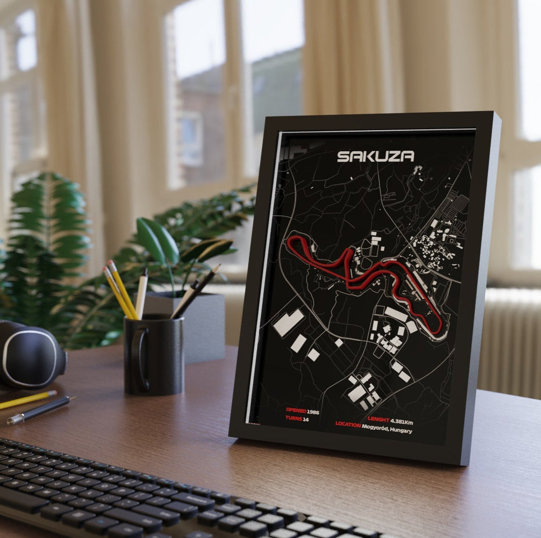 Your order includes a custom 3D printed race track, beautifully set within a solid black wooden frame for added durability and aesthetic appeal.